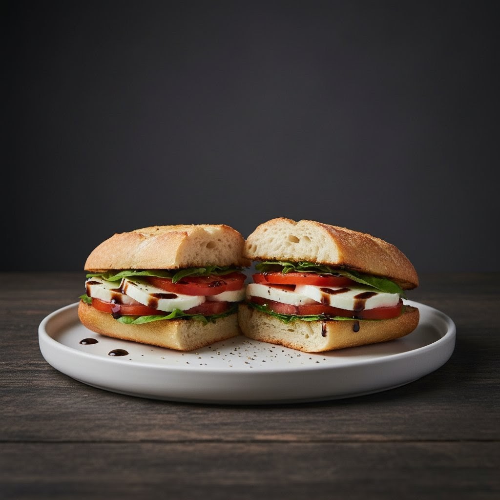 İtalyan klasiği. Taze mozzarella dilimleri, olgun domatesler ve aromatik fesleğenli pesto sos, kızarmış baget ekmeği üzerinde.