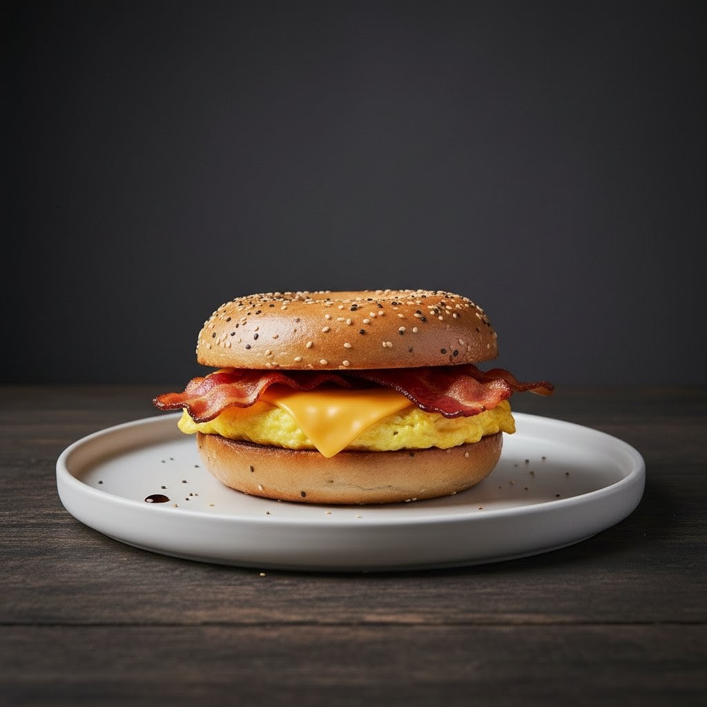 Güne mükemmel başlangıç. Pofuduk çırpılmış yumurta, eritilmiş cheddar peyniri ve çıtır dana bacon, taptaze susamlı bagel arasında.
